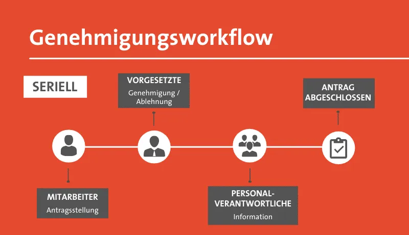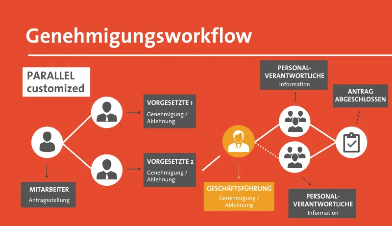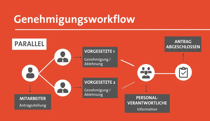 Bei einem parallelen Genehmigungsworkflow wird ein Antrag (Sonderurlaubsantrag) gleichzeitig an zwei Rolleninhaber einer Rolle (z.B.: Vorgesetzter) gesendet. Ganz nach dem Prinzip „first come – first serve“ gilt der Antrag als genehmigt/abgelehnt, wenn einer der beiden Rolleninhaber diesen freigibt oder ablehnt.