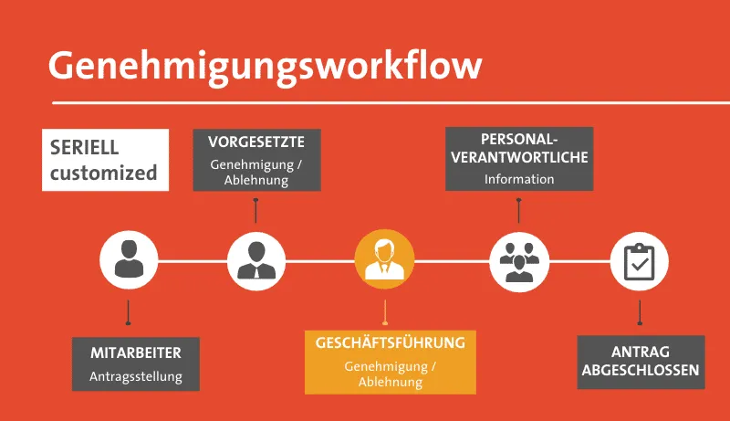 Anträge & Genehmigungs- und Freigabeworkflows: Standardgemäß gibt es in der Personalwolke zwei Arten von Genehmigungsworkflows: seriell und parallel.Eine serieller Genehmigungsworkflow beinhaltet mehrere Rollen/Instanzen die nacheinander in diesem Fall einen Antrag (Zeitausgleich) genehmigen müssen.