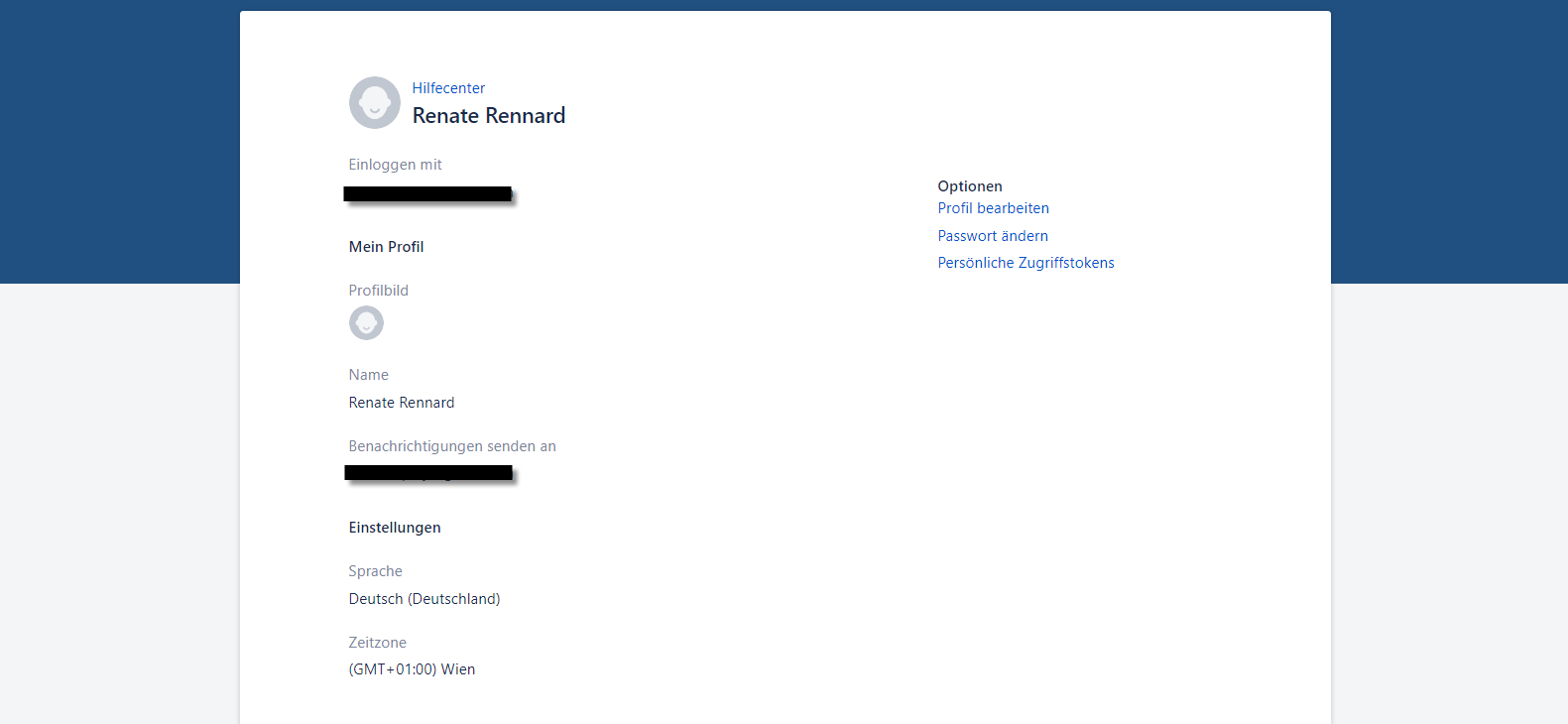Rechts oben finden Sie die Möglichkeit, Ihre Profildaten in einem gewissen Umfang zu ändern, zum Beispiel, in dem Sie eine zusätzliche Authentifizierung beim Login (Zugriffstoken) hinzuzufügen.