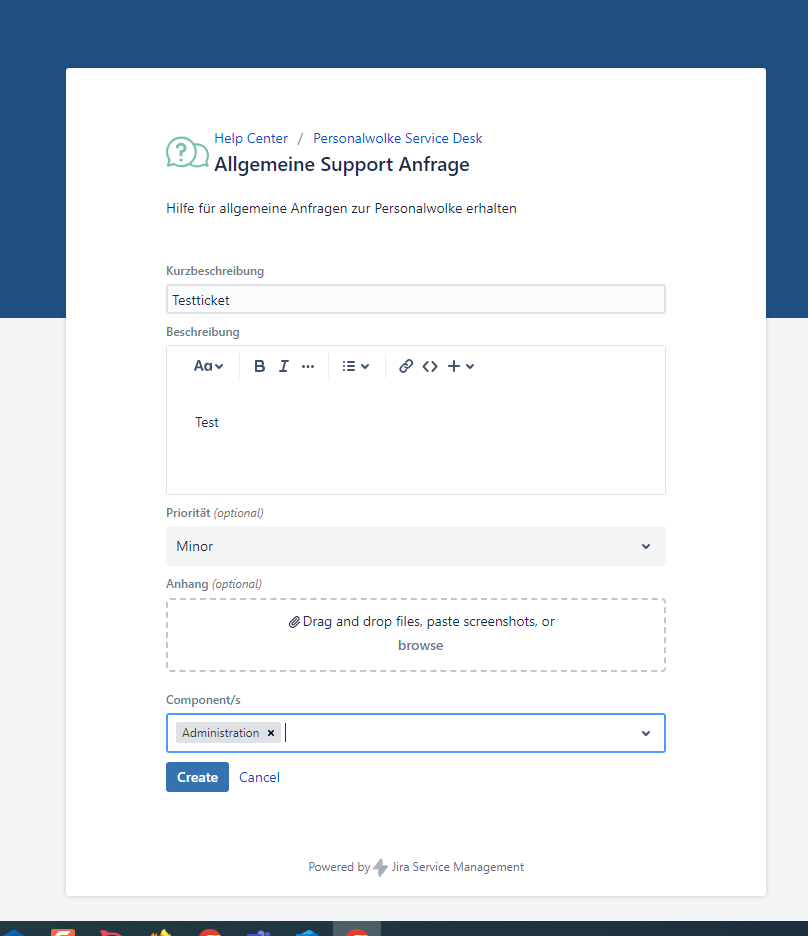 Entweder über das Personalwolke-Menü ⇒ Administration ⇒ Support ⇒ Supportanfrage