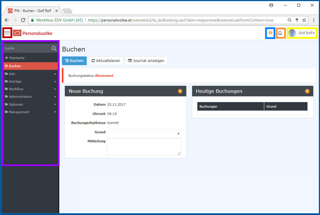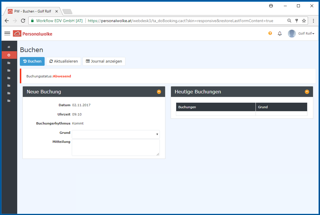 Die Startseite der Personalwolke Webdesk Software zeigt einige Status-Informationen zu dem eingeloggten Benutzer und bietet die Möglichkeit sich mittels Klick auf sofort einzubuchen (das heißt die Zeiterfassung zu starten; Kommen-Buchung) - ein reiner Login reicht für eine Kommen-Buchung NICHT aus! The welcome page of the Personalwolke Webdesk software shows some status information about the logged in user and offers the possibility to log in immediately by clicking on Book (i.e. to start the time recording; Come booking) - a pure login is NOT sufficient for a Come booking!
