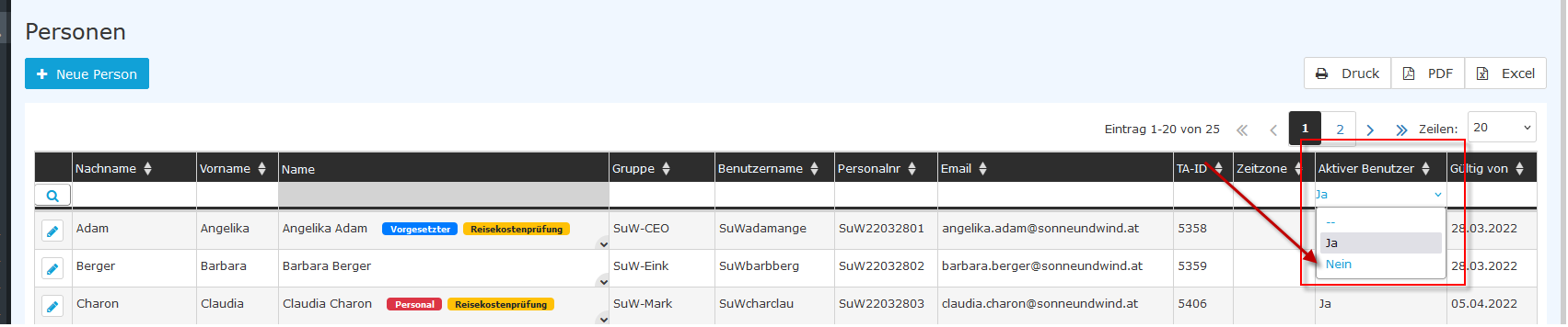 Diese Übersichtliste bietet die Möglichkeit, auch inaktive Personen anzeigen zu lassen: