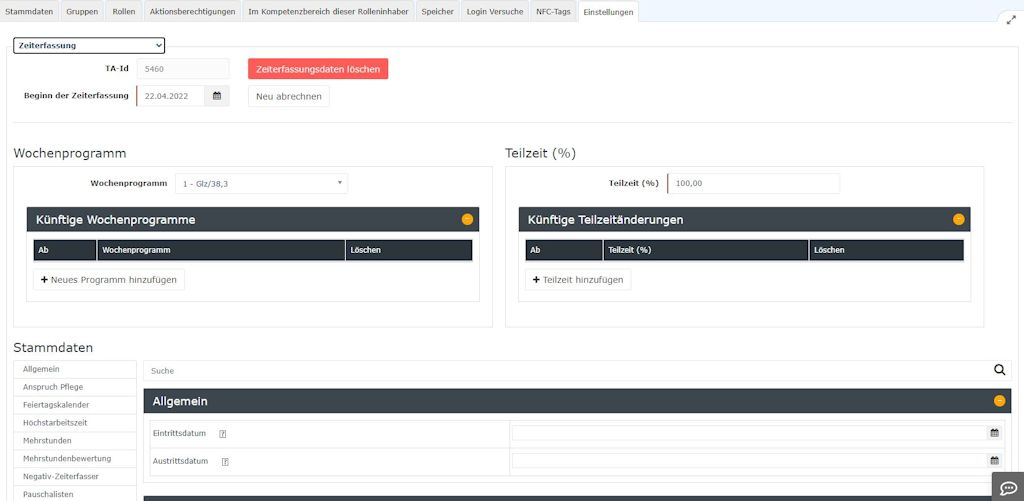Please note that the date on which daily accounting is started must not be before the leaving date, as otherwise information such as the release authorisations (monthly release, 10h / 50h cap cancellation, etc.), daily programmes, holiday entitlement values, etc. will be lost. The existing data is overwritten with the current values.