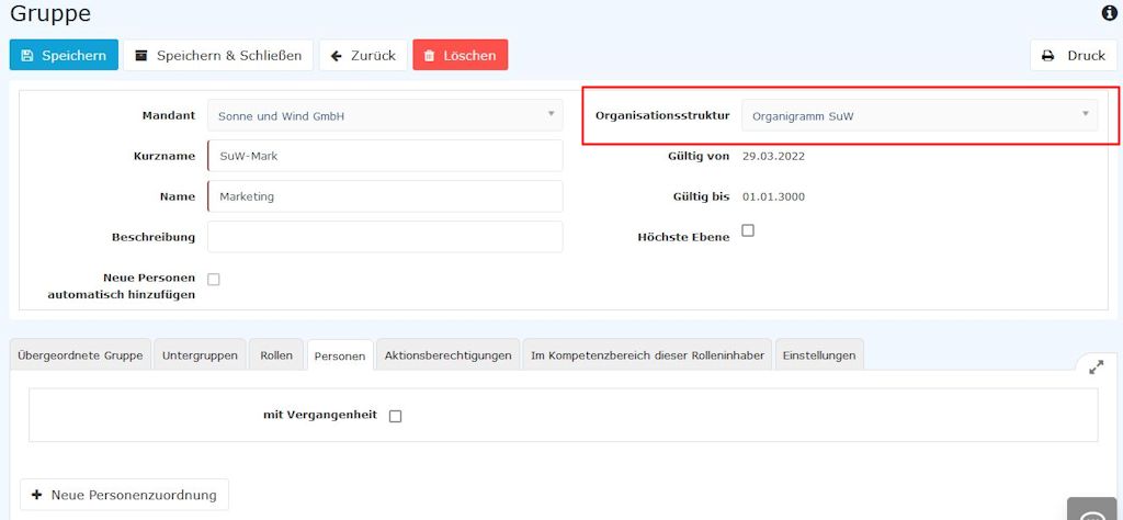 Hinweis: Die bisherige Zuordnung eines Mitarbeiters zu einer Gruppe im Organigramm wird mit Beginn der Gültigkeit der neuen Zuordnung automatisch gelöscht.