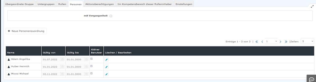 After selecting the person (Huber Heinrich in this case; the selection can be made either by simply typing in the field or by clicking on the button with the 3 dots), you can click on Save. The fields Valid from and Valid to are either filled with the default values (Valid from: Today; Valid until 1.1.3000) or - as in this case - there is the option to enter a concrete date to specify that Mr. Heinrich Huber should be a member of this group from 01.03.2023 onwards.