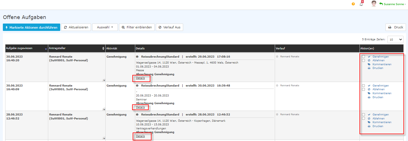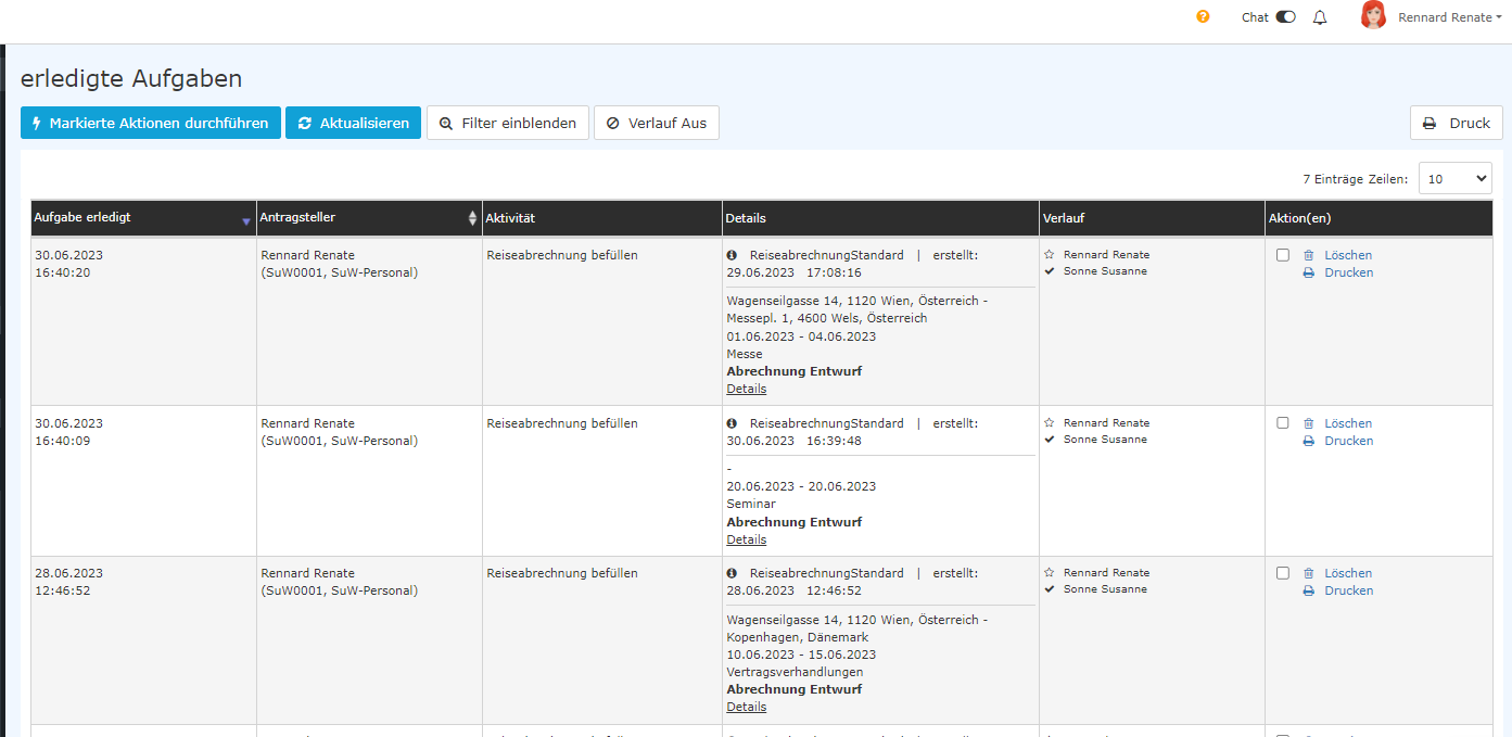 Nach erfolgter Genehmigung scheinen sie beim Antragsstellenden unter "erledigte Aufgaben" auf: