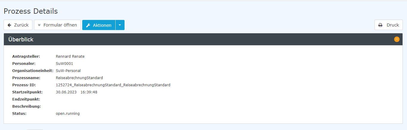 Aus der Anzeige der Prozessdetails heraus ist auch eine Bearbeitung möglich, in dem die Schaltfläche "Aktionen" angeklickt wird: