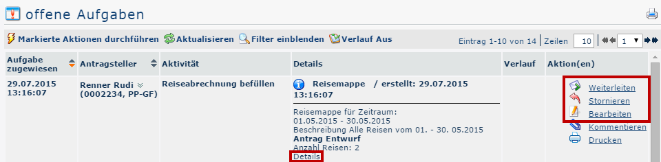 - Open the details for the request, where the travel folder also appears again.