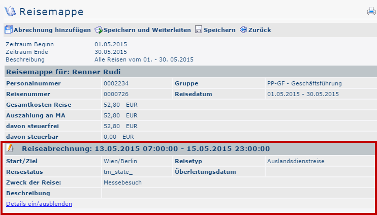 After completion of the accounting, by clicking on Save & Close, it is automatically added to the travel folder: