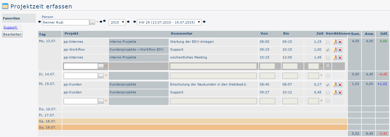 On Tuesday, 14.07., no project times have yet been recorded. Due to his presence time, there is a deficit of 4.45 hours (red). Mr. Renner has at any time the possibility to add the project times and to restore the balance.