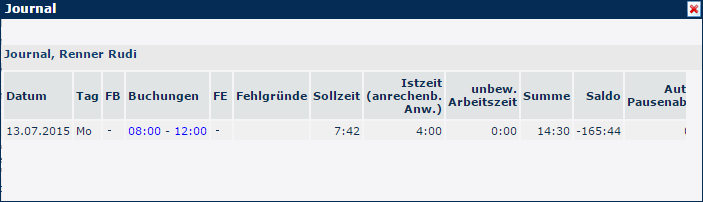 A window opens with the user's daily journal (for a detailed explanation of the columns, see Info/Journal).