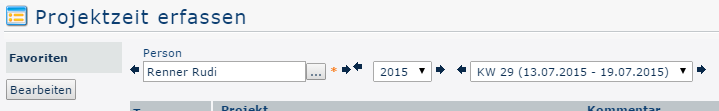 The registered user is automatically defined as the person (here Renner Rudi). The possibility to search for other persons or to switch between persons with the arrow keys and to edit the project times entered by these persons exists only for users with administration rights (members of the group XX-PTM-Admin - see Permission concept).