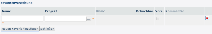 After the Add new favorite button has been clicked, a freely selectable name for the favorite must be specified in the first field. The desired project must then be selected. The Postable and Verr. columns are filled automatically. The text that is written in the Comment field is then also visible in the field of the same name in the project time - Enter mask.  As soon as all mandatory fields are filled, the save symbol KorrekturClient_Save appears, through which the favorite can finally be added. Press KorrekturClient_Delete to delete the line. Existing favorites can also be edited with KorrekturClient_Edit