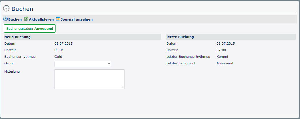 The booking status (green) is Present at the beginning, because on this day (03/07/2015) it has already been booked once. This can be seen in the overview under last booking - here the date (03.07.2015), time (07:00) and absence reason (Present) of the last come-booking are shown. In addition, the booking rhythm is Leave.