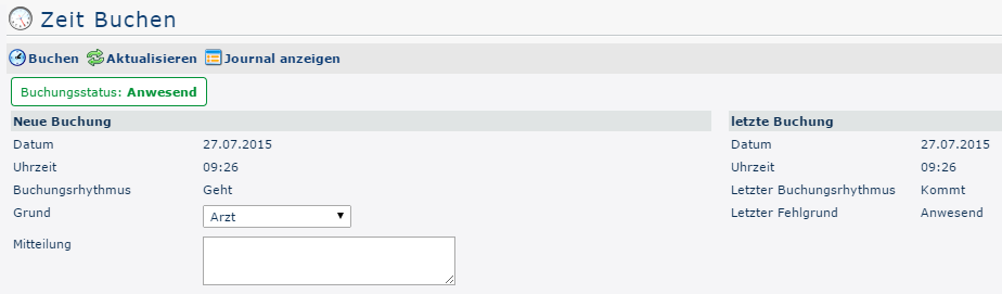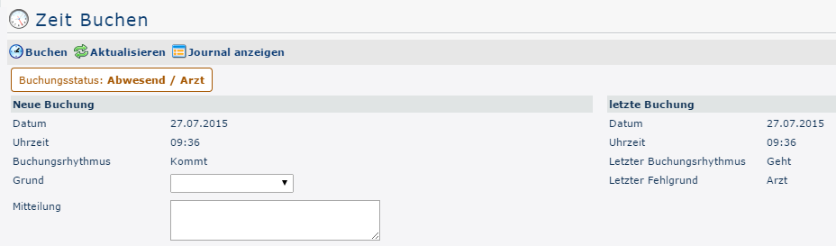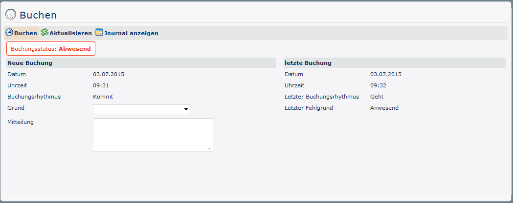 The booking status (green) is Present at the beginning, because on this day (03/07/2015) it has already been booked once. This can be seen in the overview under last booking - here the date (03.07.2015), time (07:00) and reason for absence (Present) of the last come-booking are shown. In addition, the booking rhythm is Leave.