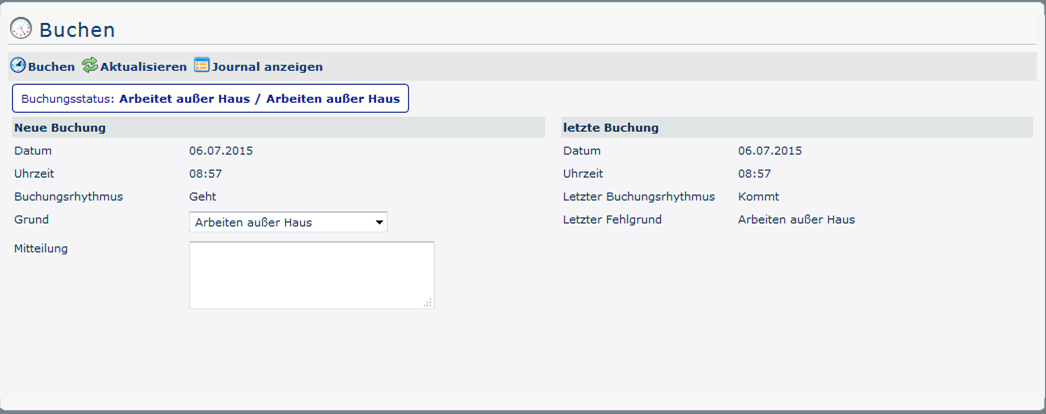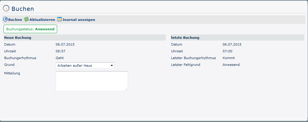 The booking status (green) is Present at the beginning, because on this day (06/07/2015) it has already been booked once. This can be seen in the overview under last booking - here the date (06.07.2015), time (07:00) and reason for absence (Present) of the last come-booking are shown. In addition, the booking rhythm is Leave.