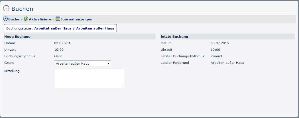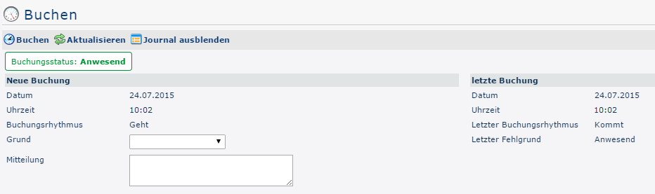 The fact that the booking status (green) is now Present confirms the success of the booking. As a result, the booking frequency is now set to Go - this means that the time recording is ended / interrupted with the next booking. Under last booking you can now find an overview of the just made come-booking. This can also be checked in the journal: