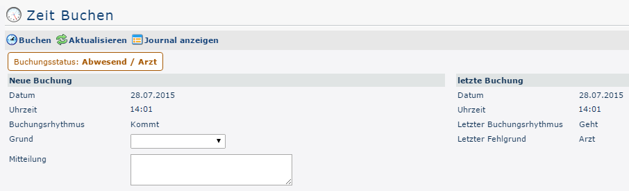 The fact that the booking status (blue) now shows the corresponding productive absence reason confirms the success of the booking. As a result, the booking rhythm is now set to Go - this means that time recording is stopped / interrupted with the next booking. Under Last bookings, you can now find an overview of the Come posting that has just been made. This can also be checked in the journal: