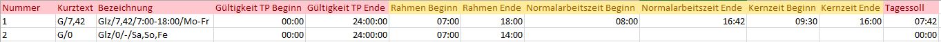 A freely selectable short name for the day program. In the above case, G/7.42 stands for a flexitime model (Gleitzeitmodell) with a daily target of 7 hours and 42 minutes. -