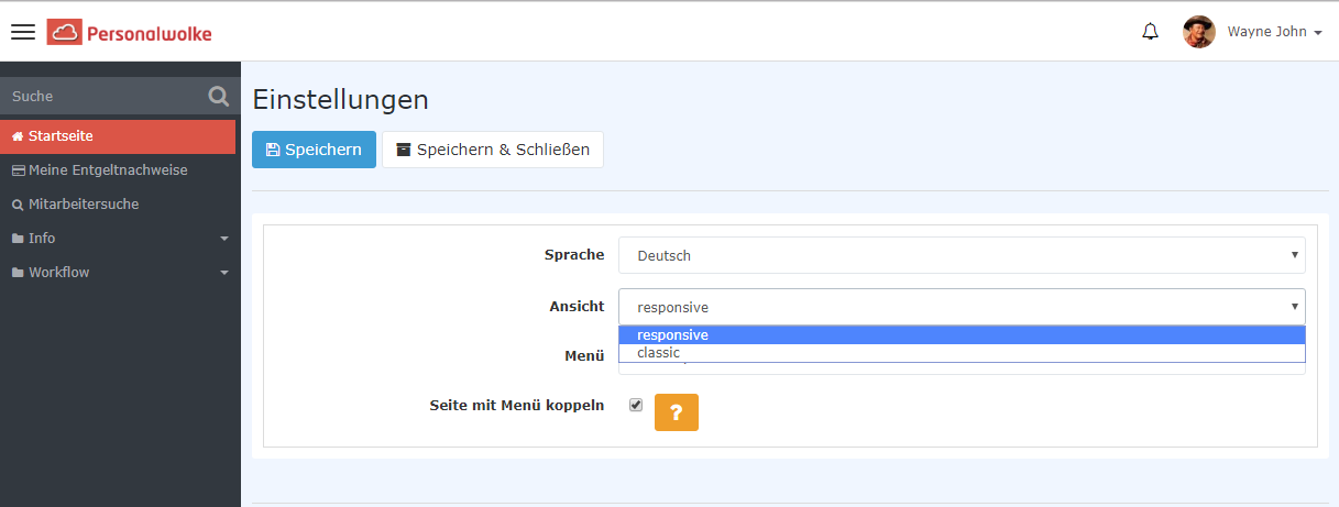 Wie auf den Abbildungen zum Thema „Abmelden“ bereits erkennbar ist, gibt es unter jeder Webdesk-Benutzeroberflächeeinen Menüpunkt „Einstellungen“. Dort befindet sich die Möglichkeit, zwischen Classic Skin und Responsive Skin zu wechseln, sofern dies freigeschaltet ist.