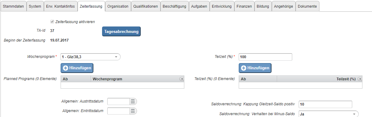 Here you define the start of time recording for this employee, his percentage working time and the weekly program to be used.