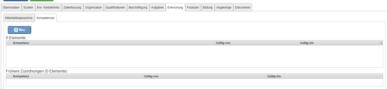 In diesem Menü kann eine Liste von sogenannten Softskills hinterlegt werden um die Fähigkeiten des Mitarbeiters zu dokumentieren. (z.B. Disziplin, Auffassungsgabe, etc)