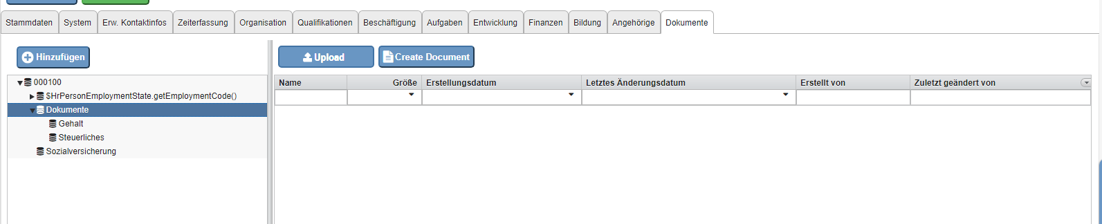 The folder structure is predefined for each client and is generated automatically when the employee is created. It is client-dependent. In diesem Bereich werden die Dokumente des Mitarbeiters gepflegt.