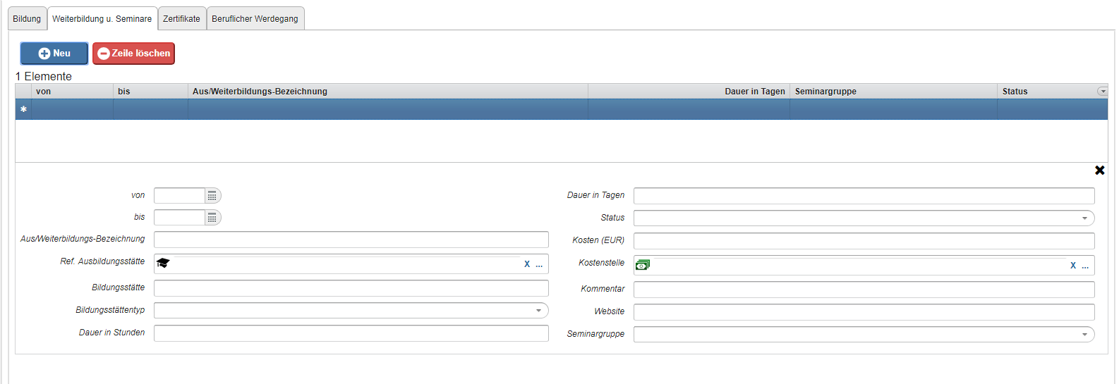 In this tab you can enter planned and realized further trainings and seminars of an employee.