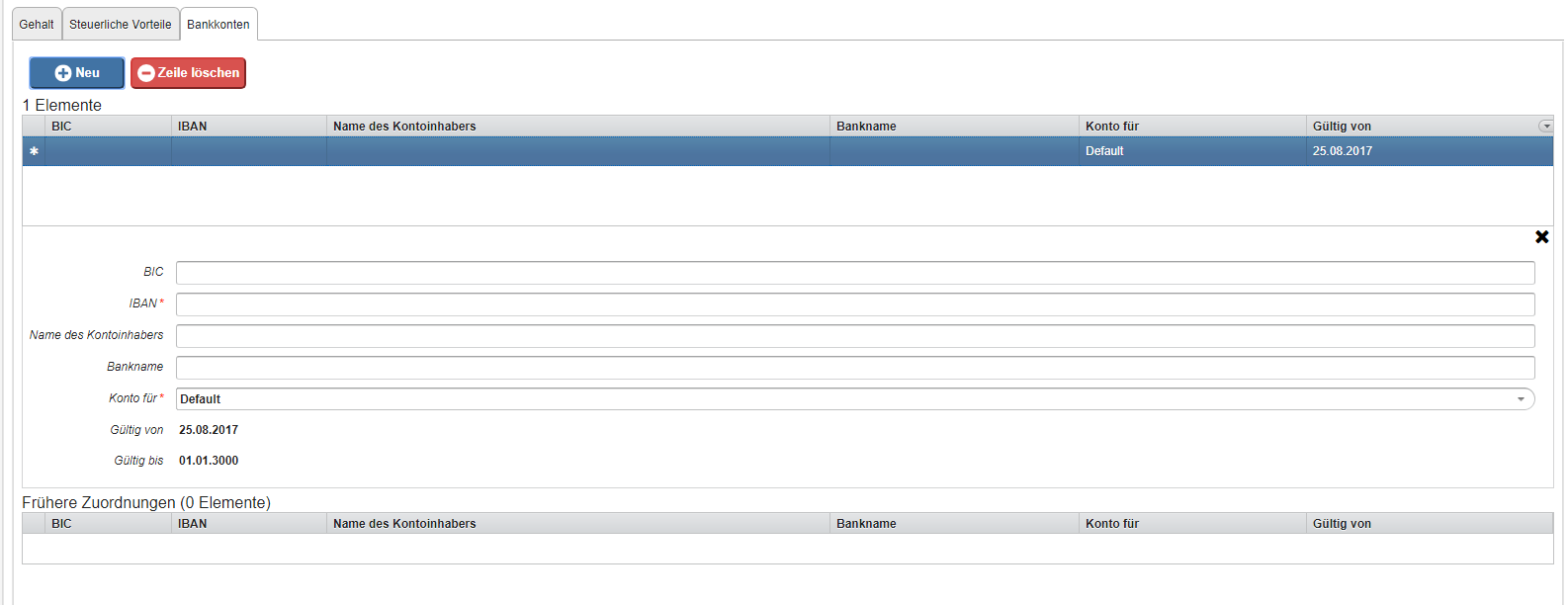 In this area, the HR admin can maintain the employee's bank accounts on a historical basis if a new data record is created for each change.