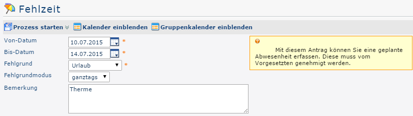 As long as the absences request is on its way (status Unauthorized), the reason for the absence is already entered in red in the calendar.
