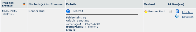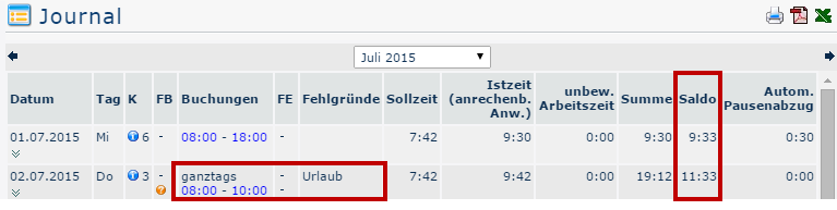 - Vacation on 02.07.2015 and booking from 08:00-10:00 - both the reason for the error and the booking are displayed in the journal:
