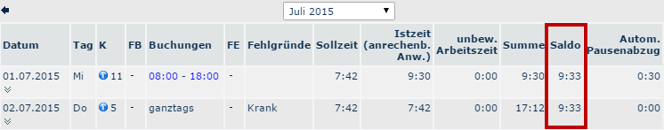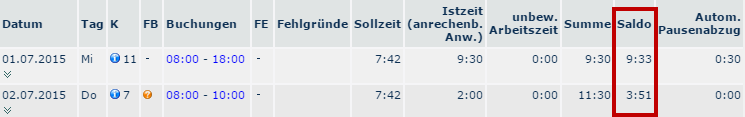 The vacation day on 02.07.2015 remains despite the booking from 08:00 - 10:00 (2 hours). The balance is increased by 2 hours (see Balance 01.07. and 02.07.).