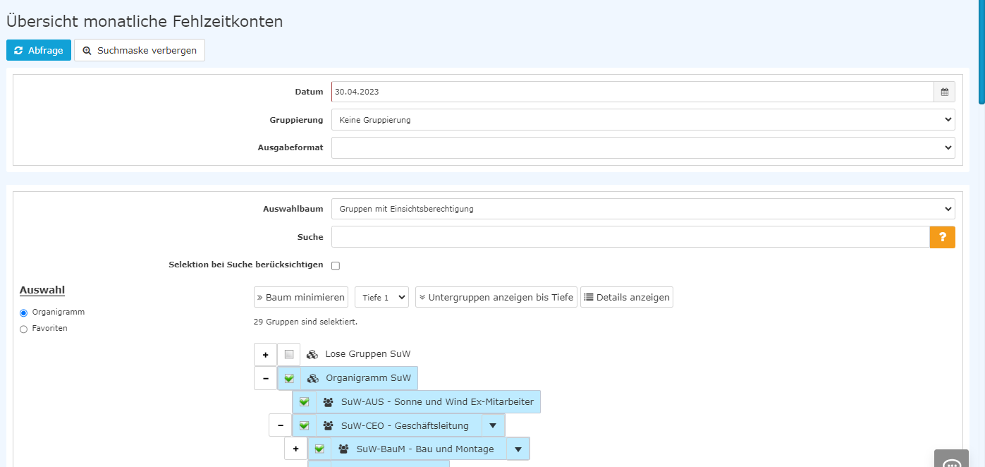 Durch die Selektionskriterien (Tiefe, Untergruppen anzeigen bis Tiefe, Details anzeigen) und durch das Auswählen bestimmter Loser Gruppen, Organigramm-Gruppen, Standorten und Kostenstellen haben Sie die Möglichkeit, die Anzeige zu präzisieren
