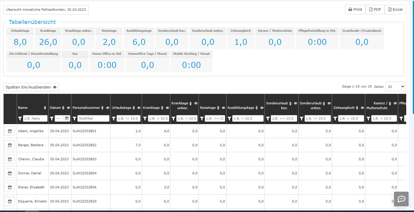 Über diesen Menüpunkt erhält der Benutzer einen Überblick über den Stand der Fehlzeitkonten innerhalb eines Monats (= vom Monatsersten bis zum ausgewählten Datum)  der Mitarbeiterinnen und Mitarbeiter. Diese Übersicht ermöglicht auch ein Filtern nach bestimmten Kriterien, wie zum Beispiel Dauer von bestimmten Abwesenheiten.