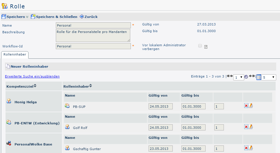 In this example it can be seen that the PB-SUP group performs the role of personnel for the person Honig Helga, i.e. all persons assigned to the PB-SUP group perform the role of personnel for the person Honig Helga. In addition one sees that the person Gschaftig Gunter takes over the role personnel for the entire enterprise (client) personnel cloud Base.