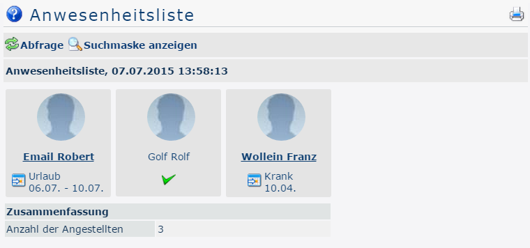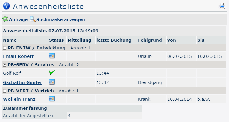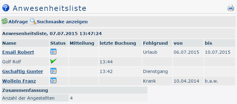 The user can use this input mask to query the presence/absence of employees according to various criteria.