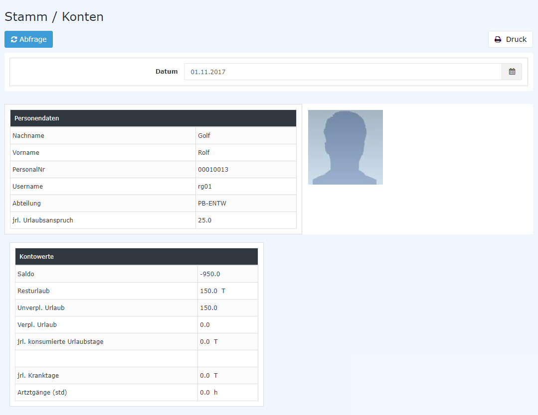 Über diesen Menüpunkt kann der Benutzer Stammdaten und Kontenstände seiner wichtigsten Zeiterfassungskonten für einen bestimmten Stichtag abfragen.