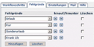 Beim Reiter Fehlgründe können neue Fehlgründe hinzugefügt werden, bei bestehenden Fehlgründen kann die Reihung geändert werden, bzw. diese auch gelöscht werden.