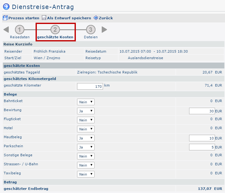 Sind soweit alle nötigen Reisedaten erfasst, kann mit einem Klick auf die Weiter-Schaltfläche zum nächsten Punkt navigiert werden. Die Navigation ist auch durch direktes Klicken auf 2 geschätzte Kosten oder 3 Dateien möglich.