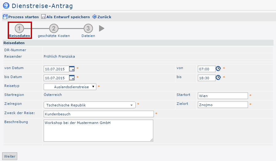 Der Name des Mitarbeiters, der den Dienstreise-Antrag stellt wird ebenfalls vom System automatisch erfasst -