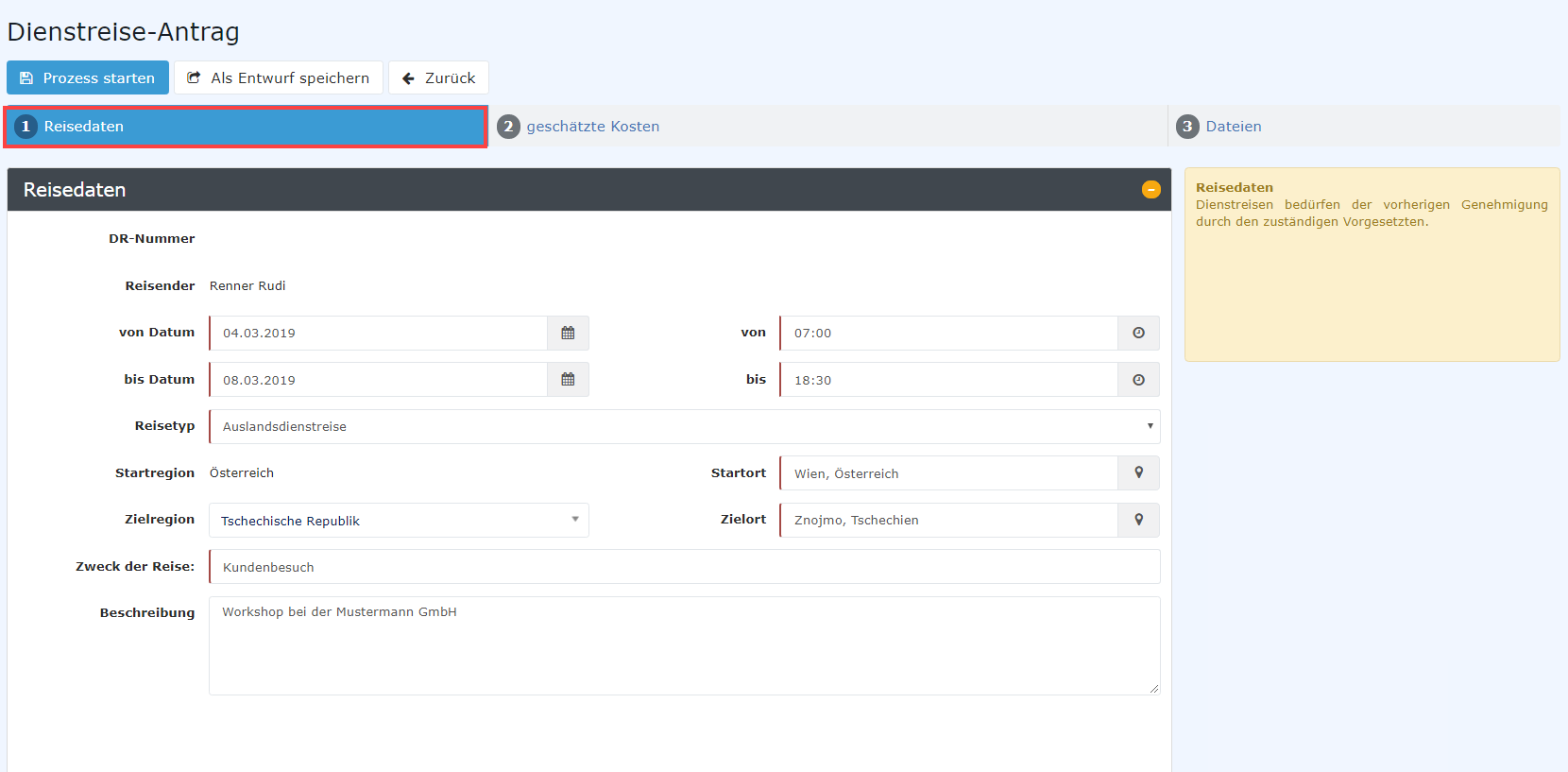 Als ersten Schritt hat der Mitarbeiter die nachfolgende Maske auszufüllen, um die wichtigsten Informationen die Reise betreffend zu erfassen: