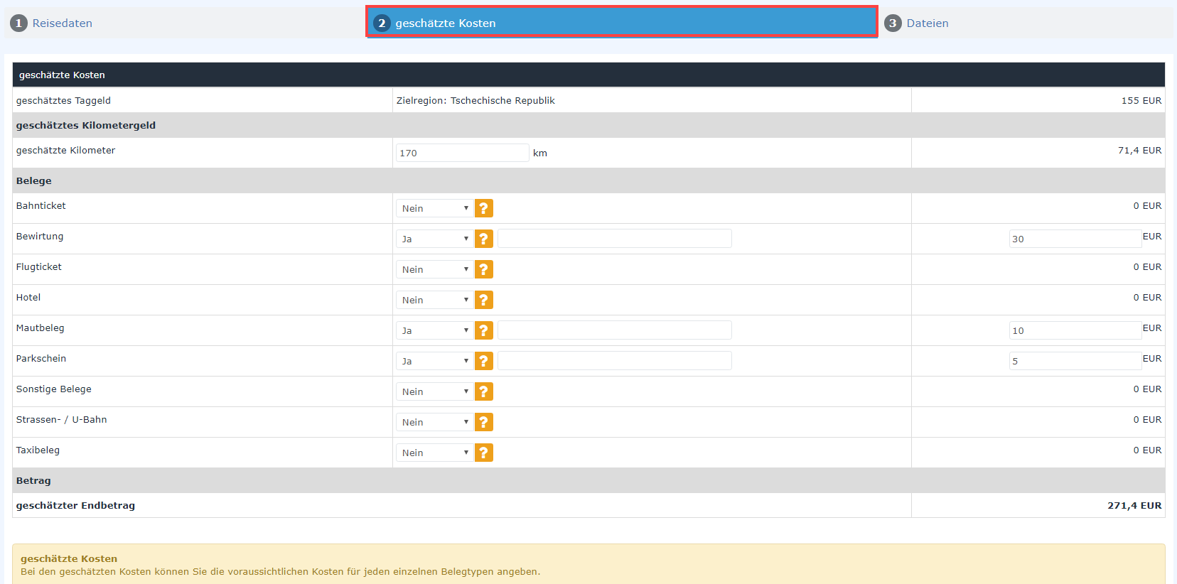 Sind soweit alle nötigen Reisedaten erfasst, kann mit einem Klick auf die Weiter-Schaltfläche zum nächsten Punkt navigiert werden. Die Navigation ist auch durch direktes Klicken auf 2 geschätzte Kosten oder 3 Dateien möglich.
