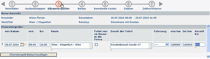 Die Anzahl der gefahrenen Kilometer ergibt sich automatisch aus der Anzahl von - bis Kilometer