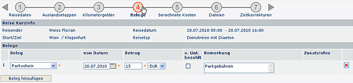 Grundsätzlich gilt für alle Belege, dass eine Verrechnung ausschließlich gegen die Vorlage des Originalzahlungsbeleges möglich ist. Diese können entweder an die entsprechende Stelle weitergeleitet werden (Vorgesetzter, Personalabteilung...), oder über den Punkt Dateien als Anhäge beigefügt werden.