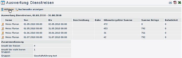 Die Übersicht über alle Einträge, welche im Fahrtenbuch zusammengefasst sind, kann über den Menüpunkt "Meine Dienstreisen" oder durch eine eigene "Auswertung Fahrtenbuch" aufgerufen werden. Die Abfrage kann nach einem gewünschten Zeitraum gestartet werden (Datum von – bis):