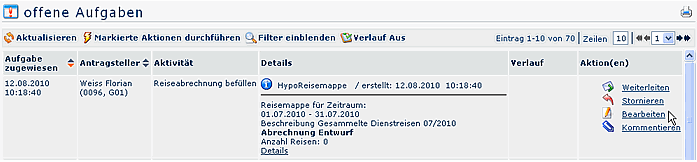 Möchte man die Reisemappe zu einem späteren Zeitpuntk bearbeiten, so ist sie in den Offenen Aufgaben zu finden, und kann von dort aus jederzeit ergänzt werden (Anklicken der Schaltfläche Bearbeiten):