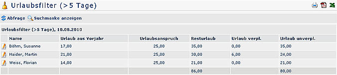 Dieser Menüpunkt dient als Beispiel für eine gefilterte Kontenliste. Sinn und Zweck solcher Auswertungen ist es, jene Mitarbeiter innerhalb einer Grundgesamtheit zu finden, deren Zeitkonten bestimmten Kriterien entsprechen. In dem vorliegenden Beispiel werden jene Mitarbeiter ausgegeben, welche aktuell mehr als 5 Tage Resturlaub offen haben. Eine solche Liste ist für die Verwaltung von Urlaubsrückstellungen am Ende des Jahres sehr hilfreich.