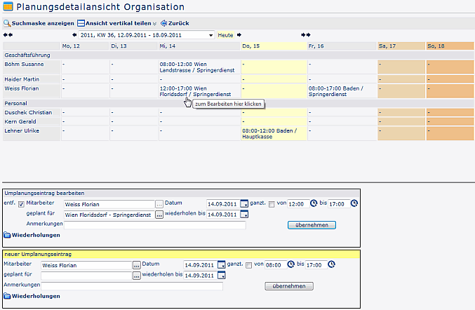 Soll der Planungseintrag geändert werden, so  kann unter neuer Umplanungseintrag die gewünschte Änderung vorgenommen werden: