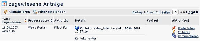 Es ist möglich, den antrag so zu parametrieren, dass er automatisch vom System erstellt wird, und an den Benutzer zur Bearbeitung weitergeleitet wird. Nach der Benachrichtigung (z.B. "Sie haben neue Anträge zu bearbeiten") kann der Antrag in der Liste "Offene Aufgaben" bearbeitet werden.
