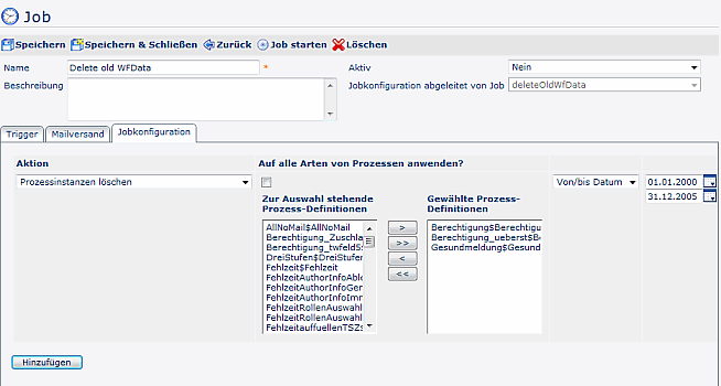 Mit dieser Aktion werden die abgeschlossenen Prozessinstanzen unwiderruflich gelöscht, welche den definierten Kriterien entsprechen.